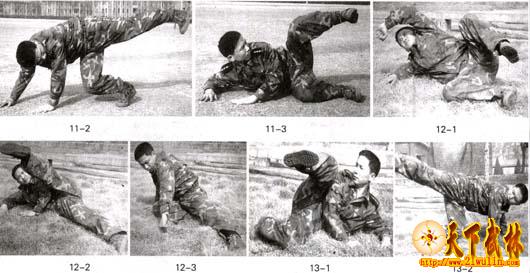动作要领:身体后倒左转身,同时拾右腿屈膝向左挡击(图13-1),两手扶地将身体撑起,右脚迅速踹击,勾脚尖力达脚跟,脚尖向左下,脚与胯同高(图13-2)。动作要求,格挡踹击要快。用途:倒地后防敌左侧右腿踹击。