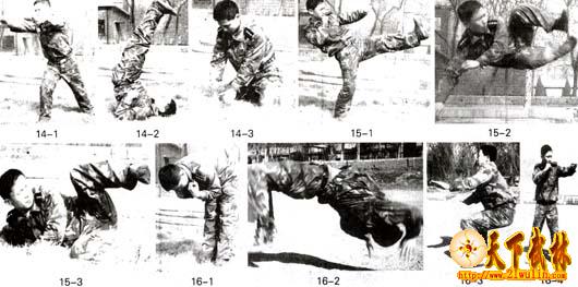 动作要领:右脚收回向前上步,同时两手扶地起立,两手半握拳前推(图?4-1),尔后用力后拉,身体下蹲,按照臀、背和头的顺序后滚,在背部着地的同时,双腿用力向上蹬击(图14 2),身体借惯性跪起,左手变八字掌向前下卡压,同时右手变拳向左摆击,双手略高于地面(图14-3)。动作要求.后倒下拉要快,蹬击要狠,下卡和摆击要协调一致。