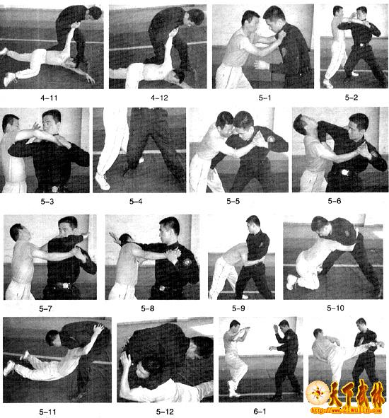 当对方双手抓握我肩部、胸部或掐我颈部时,我左手扣握对方右手,并迅速上右步成马步,同时用右挑肘进攻对方右腋;再用右手掌撩击对方裆部。借对方弯腰之机,双脚蹬地提高重心,右手臂顺势上抬肘击对方头部。左转身右手臂由对方右臂上方抽出并用右手劈掌猛力劈击对方颈部,然后顺势用右手圈绕并用力夹住对方颈部;弯腰,并向前弯折其颈部;撤步,将其压至俯卧状态从而制服对方(如图5-1、5-2、5-3、5-4、5-5、5-6、5-7、5-8、5-9、5-10、5-11、5-12)。