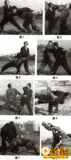 6、挟脖背摔:双方架臂互推,我速争脱一手靠近敌身,右臂挟住敌脖,左手抓紧敌臂向左下弯腰转体,以臀部撞击敌小腹,将敌摔倒(图6)。