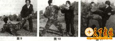 9、捋抱别摔:敌蹬腿向我,我速捋抱其腿下压,同时起一腿后绊,腿臂协同咸捋抱别摔招(图9)。