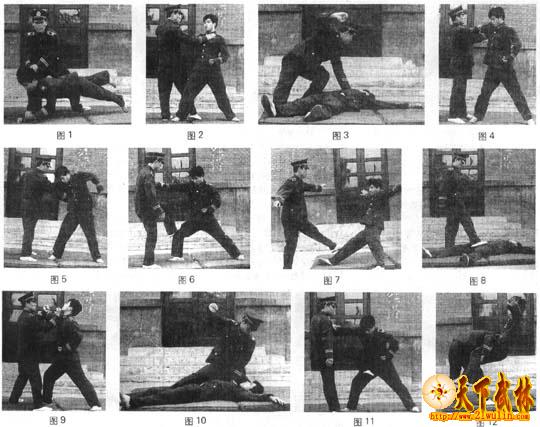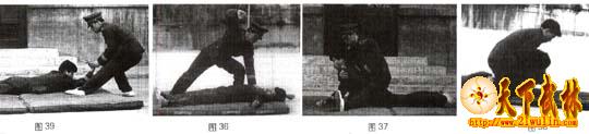 动作要领:格斗中致敌俯卧倒地,跃步骑于敌背上,一手臂锁喉,一手臂提拉敌臂于背上,两手臂互换锁喉拉提敌臂手,即成换手压伏动作(图37)。