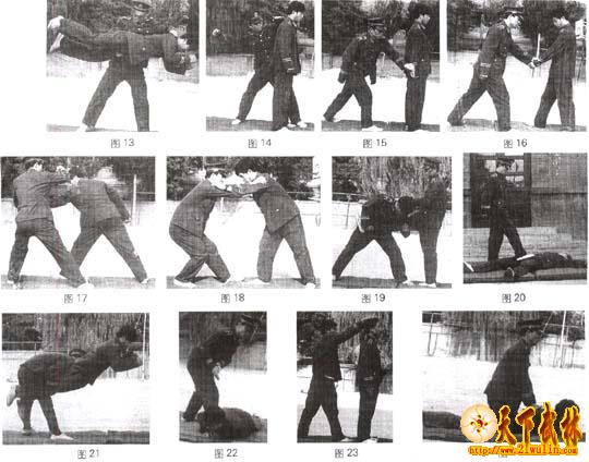 动作要领:敌由后用右手抓我头发(图23),我双手紧扣敌抓发之手臂,弯腰低头同时速右转身脱开右手成小拳由下向上猛击敌右腋穴,而后变八字掌扼喉;协同左手腕抓敌右背腕向下,配合我右腿绊打敌腿,形成侧背摔制敌。