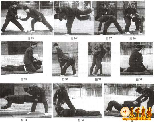 动作要领:敌直拳打我,我右防左闪,踢敌裆拉其发使敌前爬摔地;速骑敌背上两手交换由内向外掏拉敌臂于背后,按压锁拿(图24)。