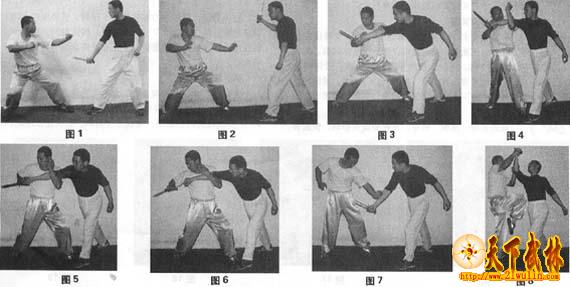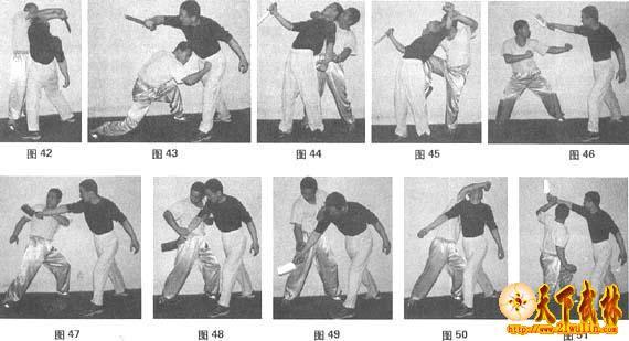 技击要领:擒腕夺刀要及时准确,快速有力步法不要太大;撞膝拧臂夺刀要动作连贯协调,下压手臂要借转体之力,完整合一。