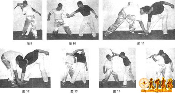 技击要领:双手擒腕要及时,九点准确;拧臂夺刀要借身体旋转之力。头撞脸要狠,要力从脚跟发;抱抄敌腿站立要稳固;抖摔速度要快,粘身就摔,毫不迟疑,干脆利索。