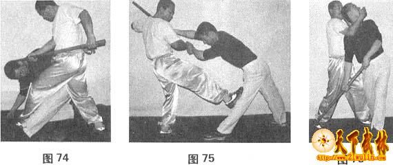 歹徒进左步,双手抡棍向我头部猛砸。我身体速向右闪,将棍躲开;同时速出双鹰手将铁棍掳带住,向后猛拽。同时,出右踹腿向敌膝盖部位猛力弹踹,将敌腿踹断(图75)。不等敌倒地,速跟步进身,用双鹰手将敌头部连抠带抓,向后旋转猛拧,将歹徒头部扭伤(图76)。
