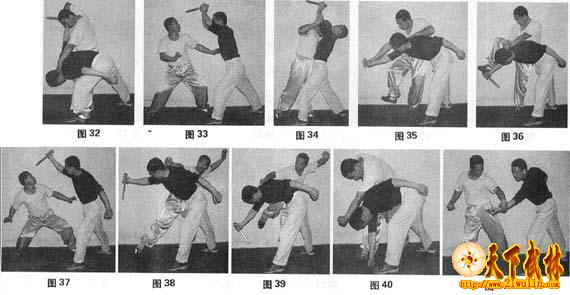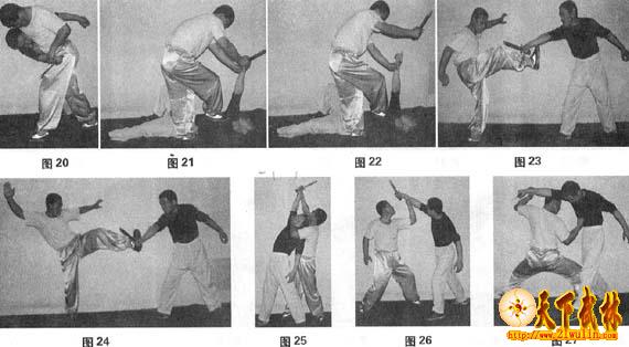 技击要领:掳棍、踹腿力点准确,速度要快而猛,稳、准、狠;搬拧敌头双臂要用旋拧之力,要有将敌头部一拧即掉的意念,方可制敌。
