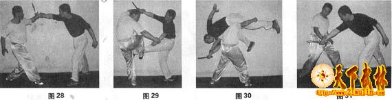 歹徒持刀向我头部抡刺,我速出左鹰手将敌手腕擒拿住(图28)。得后手,速进步,猛出右腿向敌左腿猛绊狠踢,令敌失去重心(图29)。趁机腿向前冲,用右臂将歹徒全身抱抄而起,向头前方向猛力抛摔,将歹徒摔出(图30)。