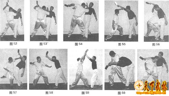 歹徒右手握菜刀,向我肩部砍劈。我趁势向右闪躲,同时出左鹰手将歹徒手腕擒拿住(图51)。同时速跟步进身,用硬叉步向歹徒裆部连冲带撞(俗称吃腿),同时速出右鹰手向歹徒咽喉部位全力抠掐,令歹徒窒息(图52)。掐中后,歹徒必疼痛难忍,向后躲闪。我手不撤回,变右肘向歹徒心口窝部位猛力点撞(图53)。同时,用左鹰手将歹徒菜刀一掳夺下,用肘撞打将敌打出(图54)。