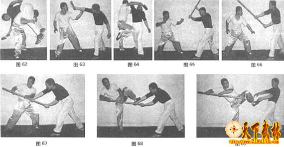 技击要领:躲棍掳棍速度要快,脚下步法稳固;夺棍要借歹徒后拉之力;跺敌脚面骨要有将其跺碎踩扁的意念;抡棍击打敌后脑海要击点准确,将歹徒一击打昏。
