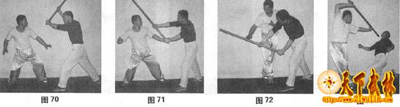 歹徒双手持棍进右步,举棍向我头部抡打,我用待敌式迎敌(图70)。趁歹徒铁棍落下未粘我身之际,身体速向左转,躲开棍击(图71)。躲开后,速用左鹰手将敌手棍掳下抓住,向后猛夺(图72)。歹徒必向后猛拽,我则趁机用左脚向歹徒脚面骨部位猛跺踩碎,将歹徒铁棍夺下(图73)。不等歹徒变化,抡起铁棍奔歹徒后脑海部位猛力点打,将歹徒打倒在地(图74)。