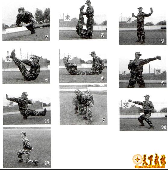 2、两人协作仰卧举腿 练习者仰卧平躺下,双脚并拢伸直,挺起脚尖,双手扣抓辅助者脚踝;双脚并拢伸直发力向上举腿,带动腰部离地上挺,以肩部着地;辅助者可抓住其脚踝进行辅助,如此反复进行(图5)。 3、俯卧翘体练习 练习者俯卧平躺下,双手相握放置于背后,双脚挺直并拢,脚面着地;辅助者双手下压其脚踝进行帮助,练习者腰腹发力使上身翘起成反弓形,如此反复进行(图6)。 4、拔腰练习 练习者双方半马步站立,弯腰屈上体,以双臂环抱对方腰部;随后一方发力蹬地挺腰抱起另一方再放下,如此反复进行(图7) 三、臂力练习 “手是两扇门,全凭脚打人”。从这句拳谚中可见,手臂在对抗中的防守作用,也可知手臂抗打能力的训练十分重要。抗打能力其中一个主要表现为肌肉的强度。在负重条件下进行训练,对肌肉强度提高效果明显。举例如下。 1、持砖扩胸 练习者两脚分开与肩同宽站立,双手持砖手臂伸直做扩胸运动,如此反复进行(图8)。 2、持砖拳法 练习者双手持砖在格斗势的基础上,在原地或结合步法移动做各种拳法的动作练习,以此来提高手臂的承受力,如此反复进行(图9)。 3、马步推砖 练习者马步站立,双手持砖做推击动作,以此来提高手臂的承受力,如此反复进行(图10)。 四、腿力练习 腿法在对抗中的运用相对较多,因此加强腿部的抗打能力训练是练习者的重点。腿部抗打能力与力量练习应紧密结合起来。举例如下。 1、单腿深蹲 练习者单腿支撑身体站立,双臂两侧伸直成立掌,一腿抬直与地面平行,随后单腿屈膝落臀做深蹲,如此反复进行(图11)。 2、半蹲跳 练习者屈膝半蹲,双手后背,双脚前后交替做原地的屈膝半蹲跳,如此反复进行(图12)。 3、负重踢腿 练习者腿绑重物,在原地或结合步法做各种腿法动作,如此反复进行(图13)。 4、仰卧蹬腿 练习者仰卧,双手抱头,双脚举起,在空中做蹬踩动作,如此反复进行(图14)。 五、撞击练习 通过撞击练习体会身体由放松到紧张再到放松的松紧变化感,让身体肌肉、呼吸状态、骨骼体态及内脏系统在撞击训练中得到整体的训练。撞击时,发力要沉实,重心稳定,相撞的瞬间全部肌肉紧张,以防内脏受震。 1、自我磕臂