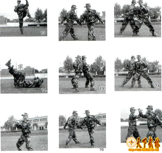 练习者双脚分立略成马步,气沉丹田,意守两臂,两手握拳,两臂屈肘交叉置于体前;然后,两臂上下相互碰撞,碰撞时呼气、分开时吸气(图15)。 2、三靠臂 两人面对面成左弓步,相距约一臂距离。第一靠,双方同时左转体,带动右臂向前摆相互磕小臂内侧于腹前(图16);第二靠,双方同时屈臂上抬,自下而上,相磕小臂外侧于胸前(图17);第三靠,双方同时伸臂内旋,自上而下,两臂磕小臂内侧于腹前(图18)。左手动作与之相同,左右交换反复练习。 3、弧行步三靠臂练习 弧行步三靠臂的靠臂动作与三靠臂相同,只是在靠臂过程中加上步法,在行进间进行靠臂练习。其步法以靠右臂为例,第一靠,左脚向左前方上步,成左弓步。第二靠,右脚向前上步成交叉步。第三靠,左脚继续向左前方上步,成左弓步。然后换靠左臂,向相反方向迈步,反复练习。 4、撞背练习 练习者背对墙或沙包、树桩等物体;或两人以背相对,约半臂距离。开步站立,两臂屈肘抱于胸前,用背部相互撞击(图19)。 5、靠肩练习 以右侧撞为例。双方侧向双臂屈肘抱于胸前,开步站立成半马步,右脚相扣,上体相距约30厘米,然后蹬伸左腿,重心前移,双方侧身以肩相撞。左侧动作与之相同,左右转换反复练习(图20)。 6、靠髋练习 以右侧撞为例。双方侧向双臂屈肘抱于胸前,开步站立成半马步,右脚体后交叉,上体相距约20厘米,然后蹬伸左腿,重心前移,双方侧身以髋相撞。左侧动作与之相同,左右转换反复练习(图21)。 六、拍打练习 拍打是通过自身或相互拍打,从而提高练习者身体各部位的抗打能力。主要拍打人体的要害或容易受伤的部位,如胃部、肋部、头部等部位,通过对这些部位的打击,提高这些部位的抗打、抗震能力,以减少在实战中受伤害。