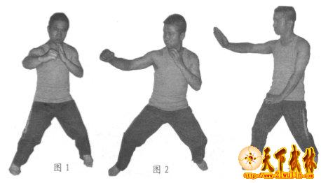 前弓后马式(图2):身体下蹲,右脚在前,脚尖向左斜45度左右,左脚在后,双脚间隔距离约宽于肩,架型比较低,右手在前握拳,左掌位于胸前,肘关节弯曲夹角要求同四平马步式,下颏微收,目视前方。此式也属于南拳风格格斗式,相对四平马步式来说,防守方面已有很大的改善,采取的是侧身站位,大大减少了暴露的受攻击目标,提高了防守能力,且双手的位置对施展防守技术与进攻技术都比较方便,而且步稳架实,在格斗中可以说是稳进稳退、步步为营,然后施以凶狠南派拳法于重击。它的欠缺是架型低,移动速度慢。同时,要想用腿法进攻,必须有个起立过程才能用腿,造成进攻速度慢而失去最佳进攻时机。而且步型低,腿的部位负担比较重,也会造成腿部神经始终处于紧张状态,使双腿极易疲劳。此类格斗式的形成,是由于南方地理特征及南拳重拳法而少腿法,仅有的几种腿法也是低位腿法的截、弹之类的。但此格斗式步稳架实的特点适于活动空间小,不方便用腿法的地方使用。