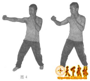 霸王敬酒式(图4):下颏微收,目视前方,侧身,右脚在前,脚尖左斜呈夹角约45度,左脚在后,双脚间距与肩同宽,左脚与右脚平行站立,右脚尖与左脚跟在中心线上,膝关节微屈。右手在前伸直握拳,拳眼朝上,拳与肩相平,左手在后为掌立于脸左侧,掌尖高同耳平,肘关节夹角小于60度。此格斗式弥补了左侧防守漏洞,提升了防守能力。同时,它的架型又能快速移动进行闪避和腿法等技法的实施,体现出“手是两扇门,全凭腿打人”的北腿技击特点,在格斗时也比较容易把自己调节到放松状态,从而提高格斗的持久耐力。缺陷是前手伸直,要想前手实施拳法进攻,那就必须先收回再出击,这样就会多费时间而贻误战机。用此架型也要注意膝关节曲度不要过大。