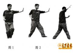 一、追魂无影腿功练习方法 (一)弹踢横扫腿法 以鼻吸气,由格斗预备姿势开始,意想天地精华之气由全身毛孔进入体内,聚入丹田;以鼻呼气,右腿支撑身体,左腿向前上弹出,力达脚尖,目视左脚方向(图1),意想丹田内气沿左腿内侧注入脚尖,这时似有顽石被踢碎之意。 |