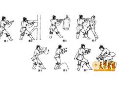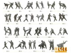 侠拳,广东十大名拳之一,相传为大侠李胡子(金钩禅师)所传,属少林达摩派。侠拳常用撑捶、挞捶、插捶等打法,大开大合,气势威猛。下面即举例介绍此拳秘技。 实例一 1.敌我对峙。 2.我向前进一步,落步成左弓步,同时左手握拳向下发力劈砸对方右手臂(图1)。 3.接上
