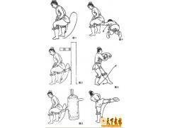 按:图文中部分动作乃属格斗绝手,非与敌决战不轻易施用。诸如割喉划颈,可当场致敌身亡;刺目蹋裆可瞬间致敌伤残,轻则剧痛必败。 一、踹腋劈面 1、与敌交锋,敌双手持锹向我头部下击,我速以左脚用力踹击敌右腋,身体重心移于右腿,右手握镰,目视对方(图1)。 2、紧接