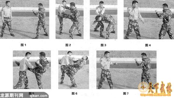 实用说明:我露空胸腹部,那是要害之所在。诱敌攻击,敌一般会用拳或腿打击。我以肘与膝同时外挡与内收进行防守,随后用拳用腿进行突击,以其人之道还制其人之身。此技防守是重点,做的是立体型防守。用脚用拳反击时,力争一锤定音。