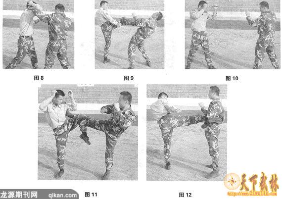 实战过程:我采用半空式与敌对峙,此时,我双手握拳上抬双肘护头部,露空胸腹部诱敌攻击(图10);敌起脚向我中盘攻击,我迅速抬膝并与肘下压挡腿防守(图11);我落步的同时,起右脚横踢敌肋部制之(图12)。