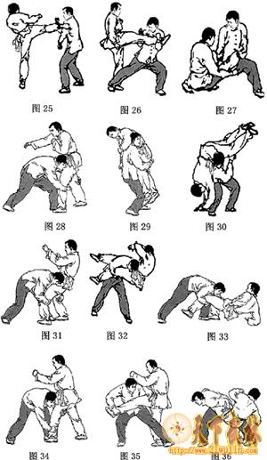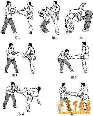 要点:接抓腕要及时,上步进身要快速,领臂、进身与左臂伸进过裆要同时;左臂要伸直,别对方之腿与左肩后靠对方腹部要协调一致,发劲要整、要快。