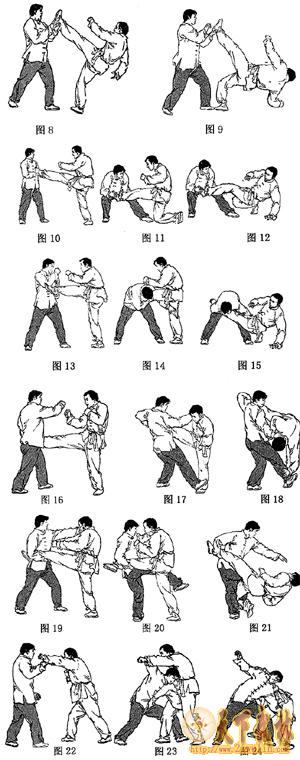 对方右腿支撑身体,并用左低边腿向我右肋部踢来时;我左脚速向前上步进身,成为左弓步,并用左臂抄抱对方踢来之左腿,同时左掌向前按推于对方左肩部(图19)。接着,我右腿向前上步于对方右腿外侧后方,挂绊住对方右腿(图20)。不停,我右腿向后别绊对方右腿,同时我右臂挟抱住其左腿上抬并前送,左手用力向前下推按对方左肩胸,使对方后跌摔于地(图21)。