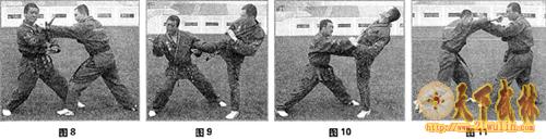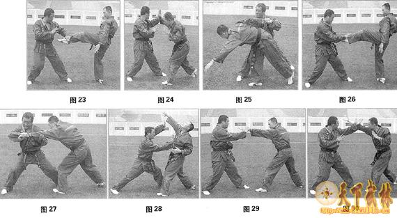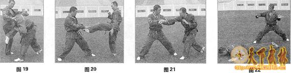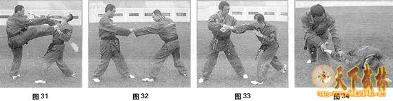 【解析】 练习退步横拨+闪步叼抓+拉臂切掌组合技术,掌握切掌技术的应用方法。 第十三式大鹏展翅(弓步?掌) ①双方搭手对峙。 ②当对方右脚前蹬踢我胸部时,我左脚向右闪步,左手托抓对方右脚跟(图38)。 ③对方右脚趁势向下踩落,左脚紧跟,以左冲拳向我胸部发动猛力攻击;我左脚迅速向左闪身移步,左掌向外叼抓对方左手腕(图39)。 ④随即我右脚向前进步,插入对方裆下,右掌从对方腋下横臂 出,将其向后掀翻倒地(图40)。 【解析】 练习闪步托抓+闪步抓扣+拉臂 掌组合技术,掌握 掌技术的应用方法。 第十四式乌龙探海(崩拳蹬腿) ①双方搭手对峙。 ②当对方右冲拳向我胸部打来,我两脚向后退一小步,左掌成“横掌”向下扣按对方左手臂(图41)。 ③随即我两脚向前上步,以右崩拳向前崩打对方右侧肋部(图42)。 ④对方迅速吞身收腹,我趁势两脚疾步向前,以右脚侧踹踢对方胸部,使其失重倒地(图43)。 【解析】 练习退步扣按+上步崩拳+疾步侧踹组合技术,掌握侧踹踢技术的应用方法。 第十五式螳螂捕蝉(搬臂反手) ①双方搭手对峙。 ②当对方左冲拳向我胸部打来,我两脚向后退一小步,左掌成“横掌”向下扣按对方左手臂(图44)。 ③对方趁势两脚上步,以右冲拳向我面部发动攻击;此时我左脚迅速向左闪步,以右掌再次叼抓对方右手腕(图45)。 ④随即我右掌抓握对方右手腕向上搬起,左掌从外向内用力按压对方肩关节外侧,将其压倒在地(图46)。 【解析】 练习退步扣按+闪步叼抓+搬臂压肩组合技术,掌握搬臂压肩技术的应用方法。 第十六式饿虎扑食(上步按掌) ①双方搭手对峙。 ②当对方左脚前弹踢我裆部时,我两脚向后退一小步,右掌成“俯掌”向下扣按对方左脚背(图47)。 ③不料对方左脚向前落步,右脚紧跟,以右掼拳向我左侧太阳穴发动猛力攻击;我左脚迅速向左闪步,左掌成“反掌”向外格挡对方右手臂(图48)。 ④随即我左掌顺势叼抓对方右手腕,两脚迅速向前上一大步,右掌成“俯掌”向前、向下卡掐对方脖颈,将其掐拿倒地(图49)。 【解析】 练习退步扣按+闪步格档+拉臂掐喉组合技术,掌握掐喉擒拿技术的应用方法。 第十七式弯弓射虎(弓步插掌) ①双方搭手对峙。 ②当对方左冲拳向我胸部打来,我两脚向后退一小步,右掌成“俯掌”向下扣按对方左手臂(图50)。 ③不料对方两脚上步紧逼,以右掼拳向我左侧太阳穴发动猛力攻击;我左脚向左闪步,左掌向外格挡对方右手臂(图51)。 ④随即我右掌成“仰掌”向前猛插对方心脏,使其胸部软骨组织损伤(图52)。 【解析】 练习退步扣按+闪步格挡+插掌组合技术,掌握插掌技术的应用方法。 第十八式天王托塔(勾脚上托) ①双方搭手对峙。 ②当对方左掼拳向我右侧头部打来,我两脚向前上步,右掌成“仰掌”向外挑拨对方左手臂(图53)。 ③不料对方两脚继续向前上步紧逼,再次以右掼拳向我左侧头部发动猛力攻击;此时我左脚向左闪步,左掌向外挑拨对方右手臂(图54)。 ④随即我左脚突然向前上一小步,以右膝关节撞击对方裆部;同时左掌抓按对方头顶,右掌向上推击对方下颌,使对方同时受到攻击,而受伤败阵(图55)。 【解析】 练习上步挑拨+闪步挑拨+顶膝推颌组合技术,掌握顶膝推颌技术的应用方法。 第十九式老牛摆头(转身捋合) ①双方搭手对峙。 ②当对方左脚前弹踢我裆部时,我两脚向后退一小步,左掌成“横掌”向下扣按对方左脚背(图56)。 ③对方左脚顺势向下落步,以右冲拳向我胸部发动猛力攻击;我两脚迅速向左闪步,右掌向外抓扣对方右手腕(图57)。 ④随即我右手抓腕向怀中带拉,左手搬住对方左腿膝关节窝,向外用力搬起,将其翻摔倒地(图58)。 【解析】 练习退步扣按+闪步叼抓+拉臂搬腿组合技术,掌握搬腿翻摔技术的应用方法。 第二十式御史传旨(双臂缠绕) ①双方搭手对峙。 ②当对方左脚前弹踢我裆部,我两脚向后退一小步,右掌成“俯掌”向下扣按对方左脚背(图59)。 ③对方左脚顺势落步,再次以右冲拳猛击我胸部;此时我左掌向外叼抓对方右手腕,并向外旋拧;两脚向前上步,右掌从对方右腋下穿过(图60)。 ④随即突然转体右掌缠绕对方右手臂,并向下扒按对方右肩,将对方擒拿在地(图61)。 【解析】 练习退步扣按+闪步叼抓+缠臂扒肩组合技术,掌握缠臂扒肩技术的应用方法。 第二十一式川流不息(进步按挤) ①双方搭手对峙。 ②当对方左掼拳向我右侧头部打来,我两脚向前上步,右掌向外格挡对方左手臂(图62)。 ③不料对方突然蹲身下潜,上步搂抱我腰;此时我身体重心迅速下移(图63)。 ④随即我两脚突然向前上步,右掌贴在左小臂内侧,以左掌向前按挤对方胸部,将对方向后腾空打出或挤按倒地(图64)。 【解析】 练习上步格挡+蹲身下移+进步按挤组合技术,掌握按挤技术的应用方法。 第二十二式黄龙搅水(拍脚摆莲) ①双方搭手对峙。 ②当对方左掼拳向我右侧太阳穴打来,我两脚向前上步,右掌向上架起对方左手臂(图65)。 ③不料对方此招为虚,两脚迅速上步紧逼,再次以右掼拳向我左侧太阳穴发动攻击;此时我左脚向左闪身移步,左掌向外挑拨对方右手臂(图66)。 ④随即我左脚向前上一小步,以右脚向外摆踢对方右侧肋部,使其肋部软骨组织损伤或折断(图67)。 【解析】 练习上步架掌+闪步挑拨+上步摆踢组合技术,掌握摆踢技术的应用方法。 第二十三式换景移山(横步扣打) ①双方搭手对峙。 ②当对方左脚侧弹
