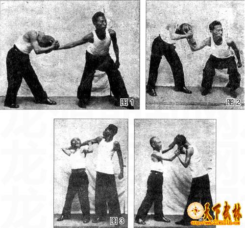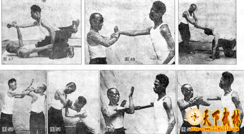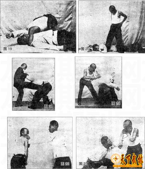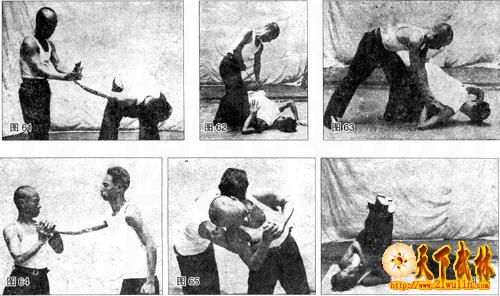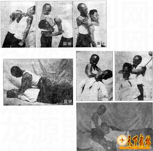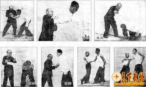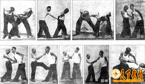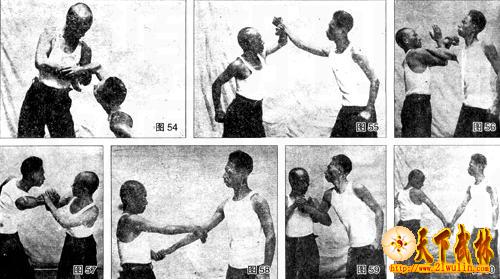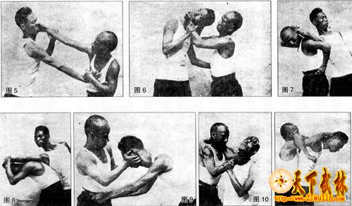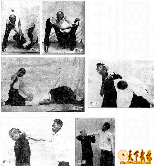擒拿斯技,乃运用点打拿摔诸法,极尽分筋、错骨、闭气、点穴之能事,强调运用巧劲,不尚蛮力,向来为世所重视。武术界有所谓人体有三十六大穴、七十二小穴之说,擒拿法也常惯以三十六把、七十二把或一百零八把之称,此皆古人附会三十六天罡、七十二地煞之观念而来,无一定之关联性,不可视为定法。而中华传统武术中精擒拿之技者代有高人,旧时民国浙江省国术馆教习刘金声即极擅此术。 刘金声,原籍山东人,据其自述所称,研习擒拿之术极早:“……幼年,即受外祖方成训先生秘授古人抄本,照图锻炼三年,……后经北方名师王子平先生等二十余人之指教,锻炼各种拳术。”清宣统三年(1911年)辛亥革命前三个月,浙江反清人士在杭州成立国民尚武会。民国18年(1929年)7月,浙江省国术馆成立,省长张静江为馆长。同年,国术游艺大会在杭州举行,以中央国术馆为主的全国武林高手云集杭州,举行为期一周的比赛。此后,不少好手留在浙江省国术馆和十大教练站教武术,一时杭城习武之风大盛。苏景由主持的浙江国术馆邀请太极拳传人杨澄甫、武当掌门高振武、“铁腿”刘百川等武术名师,来浙任教,使浙江成为武林高手荟萃之地。当时十大国术教练站是:三圣巷所(汤鹏超主持)、官巷口枝头巷所(刘金声主持)、吴山所(韩庆奎、蒋玉坤等主持)、仙林寺所(朱强等主持)、南班巷酒业会馆所(奚成甫主持)、社坛巷所(谢茂林等主持)、琵琶巷所(如修和尚主持)、道院寺所(张士贤主持)、笕桥南星桥所(朱孔武主持)、油竹桥财神殿所(朱元江主持)。刘金声能在如林高手中脱颖而出,主持当时的十大国术教练站之一,足见其功夫精深。 1937年前浙江国术馆著名武师及所擅武功:杨澄甫、田兆麟、李椿年(太极拳、剑、枪、推手);刘百川(罗汉拳、子母连环鸳鸯腿、单刀九节鞭);高振东(形意拳);高守武(太乙醉拳、金刚拳);韩庆堂(查拳、洪拳、花拳、炮拳、摔跤、擒拿);奚诚甫(杨家枪、猴拳、武松脱铐);肖聘三(黑虎拳);丁彪(螳螂拳、十二路潭腿、三才剑);刘金声(擒拿、螳螂拳);腾南璇(女,佩剑对刺、太极剑及太极拳);陈秉衡(八卦掌)。由之可见,刘金声对擒拿之技业有专攻,亦声名在外。 1936年,刘金声与友赵江根据师传古本擒拿法秘钞,整理总结成七十二把分筋错骨、截脉闭穴手法,其技精巧实用,施术范围涵盖人体全身上下大小关节筋脉,并合照配附图片以传后世。今谨将珍藏之此七十二手擒拿秘法谱文拳照述录于下,供喜好武学技击之诸君共鉴参考,亦可见我纯正实用之中华传统擒拿法,不输于当今泊来流行的柔道柔术擒锁之技。 (一)头部拿法 第一节前抓发甲 此势系敌迎面将头发抓住时用此法拿之。 说明:甲(乙)已被乙(甲)用右(左)手迎面将头发抓住即速以双手将其抓来之手扣紧,用劲向后拉,身体与头同时向后仰。务将其胳膊拉直而手腕微弯时,复猛向前一伏头与手一齐用劲,向右(左)后拉,而向下冷切其外腕寸,则其腕必断矣。如第一图。 第二节前抓发乙 此势系敌与前抓发甲式同样抓来,亦可用此势拿之。 说明:甲(乙)已被乙(甲)如前式将头发抓住,即以右(左)手扣住其抓来之手,以中指插其手心内,同时以左(右)手抓住其外腕二三寸,身体与头向旁仰,而带拉劲。务将其胳膊拉直,手腕微弯时,复向前一合,同时左(右)步向前蹈一步。用左(右)肘由上向前向下压。务以冷疾脆快之劲一发,则其腕必断矣。如第二图。 第三节后抓发 此势系敌由身后将头发抓住,即用此法拿之。 说明:甲(乙)已被乙(甲)由身后以右(左)手将头发抓住,甲(乙)速以右(左)拉,同时身体随之向右(左)后转,以左(右)手由下向上托其肘尖,身体向右(左)倾头向后仰,左(右)手以冷疾劲向上托。务使其脚跃身挺,只待肘断为合法。如第三图。 第四节端灯 此势乘敌在站立坐卧间,皆可就式擒之。 说明:甲(乙)用右(左)手大食两指抓住乙(甲)之左(右)耳坠,以中指用劲向其腮后耳下高骨以上之麻筋处向里插而向上挑,同时左(右)手抓住其头顶左(右)部太阳穴以上,用劲向左(右)向下按,双手上下一齐用劲。务使其全身之神经麻木因而昏迷为合法。如第四图。此势非经过长外的锻炼手指有劲官至神行,难以奏效。 第五节抓脸 此势系敌欲击或抓我前部,可用此式擒之。 说明:乙(甲)出右(左)手向甲(乙)当胸抓来,甲(乙)速以左(右)手将其抓来之手顺势向怀内一吞。身体微向后撤,胸向后缩,将其手扣住,同时以右(左)手向其曲尺穴处用冷劲一扑,使其肘弯,身体接近,突以右(左)手反上,以大指搭其鼻梁骨之右(左)。余四指扣入其左(右)耳下高骨之麻筋处,用劲向里抓紧。务使其全身麻木不能动转,手脚想举不得为合法。如第五图。此势亦非官至神行冷疾脆快不可。 第六节摘盔 此势系敌以双手拧我头时,用此法解而拿之。 说明:甲(乙)以右(左)手抓住乙(甲)顶后之头发,同时以左(右)手推其左(右)下颌。以右(左)肘曲贴于其胸部腋下向外顶,手向下向里拉,左(右)手向外向上推。以身体右(左)部贴紧左(右)部。务将其左(右)手挤于身后,使其不能向前,防其撩阴。如第六图一式。乘上势乙(甲)见被甲(乙)用摘盔法拿住,乘其全劲未发之际,速以右(左)手向后返,将其抓发之手扣住,身体向后缩,向下蹲,以左(右)肩向下沉。以转环劲由上而下再返上,以肩尖闭住其右(左)肘向上顶,身体随之向右(左)后转。则其推下颌之手必松,右(左)手随向右(左)向下猛拉。同时肩尖向上