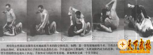 一个女性如果掌握了一定的格斗技术有许多可以在倒地后使用。当一个男人使你倒地后,在整个身体接触地面的搏斗中,你可以使用腿部、胳膊、头部和脸的正面的锁定,这些地面格斗技巧别具功效。