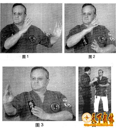 乔治·第尔曼表演手刀格挡。这种功夫的第一招是双掌后劈(图1)。第二招是向前舞动双手(图2),前面的那只手向前劈出,而后面的那只手置于胸前(图3)。正确的使用方法:肯·莫睿诺(左)一记右拳向前打出(图4),乔治·第尔曼用手刀格挡的第一招,分别攻击他的位于手腕部位和肘的外部的经渠穴和手三里穴(图5~6)。他然后通过用自己的左手抓住敌人的右臂完成了手刀格挡,同时他的右手攻击敌人的前胸的渊液穴和辄筋穴(图7),然后用他的掌攻向敌人下颚处的大迎穴(图8)。一般武师的打法:科特·马科斯(左)在距多哥·阿德特(右)六英尺远处做出防卫的姿态(图9),然后前进一步,冲出一拳(图10)。对方撤步,大幅度地挥舞他的胳膊,使出手刀格挡,一掌劈向敌人的手腕(图11)。手刀格挡的前半部分是完全自然的躲避姿势。而后半部分就是向前打出(图12)。