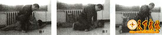 (2)顾手含义。当我倒地以后,对方迅速骑压在我身上,欲使用拧臂锁腕之际,我应用“散手道手搏原理”,突然翻身以右手横拳猛击对方肋部,使其肋骨损伤或折断,以求破解。然后,我进一步使用地面控制技术,直到完全征服对方。要点说明:翻身要猛,横拳要狠;翻压要快,控制要牢。