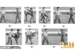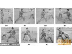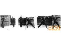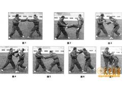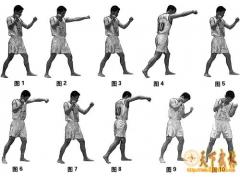 一、沉桥标指捎抛拳 1、我右式与对方右式对峙(图1)。2、对方进右步,发后手直拳或上勾拳攻我胸腹部。我右前臂向下沉压,防住其左拳(图2)。3、动作不停,我两脚向前进步,同时右臂前伸以右掌插击对方面部(图3)。4、紧接上动,我身体向右拧转,同时左手以拳面为力点经左向右横