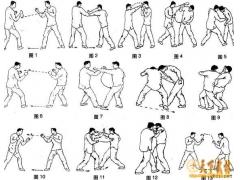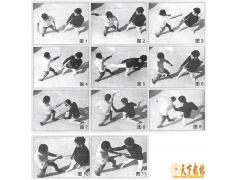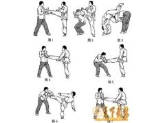 散手道紫带由24个技术动作组成,这些技术通过口令分解法、完整组合法、录像解析法、模拟实战法等训练模型,引导学生掌握原则,触类旁通,自由组合,随机应变,运用自如。 第一式老僧推门(托掌前推) ①双方搭手对峙(图1)。 ②当对方左脚前弹踢我裆部,我两脚向后退一