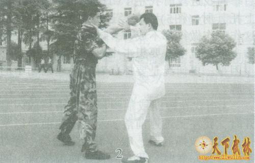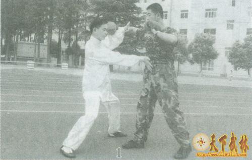 粗看起来,太极拳反复多变,但仔细推敲太极拳技击八法(?捋挤按采捌肘靠)的技击原理,确是简单、实用。在套路练习中,我暂且把起势动作分为四个阶段或者说是四种不同的运劲方法。 第一阶段:分脚、起手、下坐,我们把它理解为松静蓄气或准备作战状态。当对手突然用右拳向我面部进攻时,我通过胯转(在太极拳重心转换时几乎都是通过胯转,也就是我们常说的走裆劲)使重心移于右腿,左臂向前左?开来拳,同时右掌跟发力击打对手腰腹部(图1)。