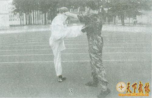 2,上动不停,对手右拳一击不中,又发左拳,这时我重心移于左腿,右臂拨开来拳,左臂顺势采劲砍击对手脖颈动脉(图2)。如对手格挡,我则起右腿抽击对手左肋部(图3);如对手闪避,我则重心右移起左鞭腿抽击对手左肋或踹击胸腹部(图4)。