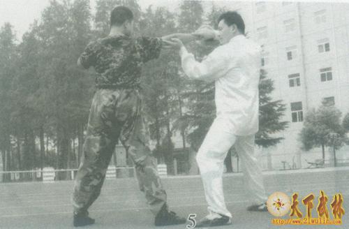 首先我们来探讨陈式太极拳的起势动作。陈式太极拳的起势动作是在自己身心自然松静的状态下完成的,这种松静状态也可以说是一种临战前的准备状态,是身心应战前的最后调整,同时起势动作也可以随时采取进攻与防守反击。王宗岳宗师《打手歌诀》日:“?捋挤按须认真,上下相随人难进。任他巨力来打我,牵动四两拨千斤。引进落空合即出,沾连黏随不丢顶。”在这里我们暂且把它的技击原则界定为“舍己从人、防守反击、凭机智与功力克敌”。根据这个原则我们用科学的方法、实事求是的态度,对陈式太极拳制敌 方法进行深入探讨、分析研究。