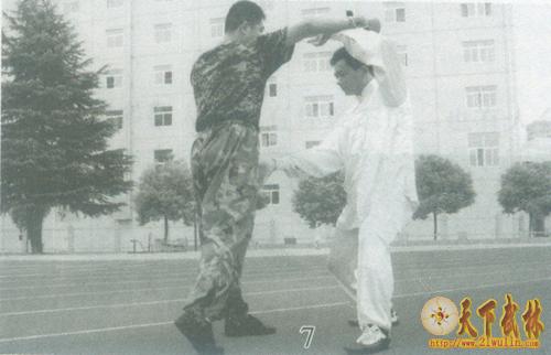 [练习要点]本势动作主要练习自身左突右闪的整体协调能力。我本人在学习之始,也有老师讲此动作是叼托手。即对手用右拳向我进攻时我左手叼抓对手手腕,左手上托其肘(图5)。在经过多次反复练习后,这作动作做得都不成功。试想:在双方快速的击打对抗中,要想击中对手一拳或一腿都很困难,更何况是要抓住对方快速运动中的手腕. 3,当我左鞭腿或踹腿被对手格挡或闪避开时,我左腿迅速前落,左掌快速前弹以掌指撩其面或插其眼、喉等部位(图6):待对手上防我左掌时,我右脚快速向前跟进,同时右掌掌指插击对手小腹或撩击其裆部(图7)。