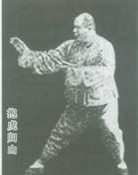 将身形后撤并用横劲转体,其势凶猛。如虎归山之形态,一旦得势,敌必跌出无疑。此式在通常情况下,惯与“打虎式”配合使用,是引进落空、四两拨千斤的典型范例。防拳反击时,以闪其势,懈其劲,随其力,放其势,使其手臂劲力过长,用力捋化,重心失去平衡而跌出。比如说,对方前进右步出右直拳击打我方面部。我左脚朝左侧横跨一步,身体向左侧前倾,闪过其拳之际,并用左手向上拦截。向右“捋”化。随着右手反划抓扣其腕,向右牵引,左手托架其臂。借右旋身之际。右脚上步扣绊其前脚,右手扣其腕向右、向后“捋”劲拽带,左掌猛击其后脑,将其击仆而出。