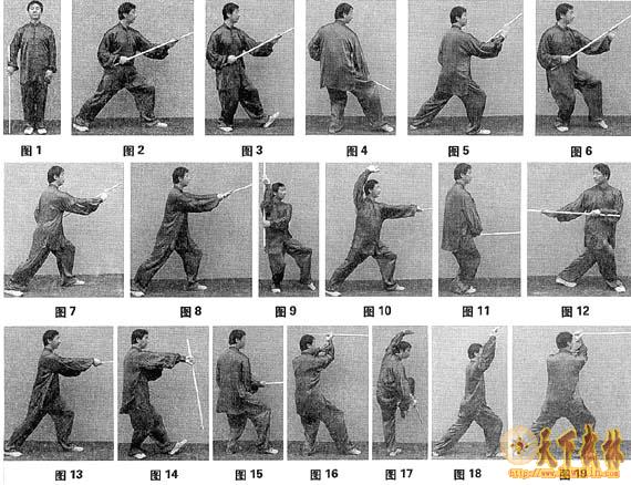 右脚提起脚尖下垂,成左独立,同时右手持鞭下截,目视鞭中段(图17)。
