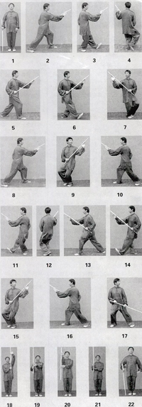 身体向左转,同时左手握鞭下滑至右手附近,同时在身体前下挂(图17)。左脚收并于右脚旁,两腿伸直,同时左手松握鞭上举,右手实握贴于左胸侧,目视前方(图18)。右手握鞭前伸,左手推在右手握鞭处上端,目视前方(图19)。右手松握鞭,在身体右侧向前舞鞭花,鞭梢端住地收式,目视前方(图 20、21、22)。