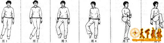 | 太极拳的单腿支撑动作,在陈、杨、孙、吴、武式传统太极拳及社会上广大中老年人演练的竞赛套路中,都有单腿(左或右)支撑的运用,而单腿支撑的好和否,则直接影响整个套路的舒展大方、美观、健身及技击效果。现仅以传统杨式太极拳及以传统杨式太极拳 为基础创编的40式竞赛套路和24式简化太极拳竞赛套路,谈谈如何掌握练单腿支撑的稳定性。 修练单腿支撑的稳定,首要的是加强底盘功夫的锻炼,如一代太极拳大师李雅轩师爷所教导:“两腿如厢底下之大盘簧,要有很大的松弹力;又如载重之舟,漂浮于江面,沉重而又有动荡的样子,所谓 动荡不是自动,而是水涛之动而动。太极拳就是要练出腿上的弹力功夫来。”那么,怎样才能练到脚下稳、腰部活、手上灵的状态?笔者认为,其一,练习搂膝拗步掌。在打左 右搂膝拗步掌时,必须松腰沉胯,立身中正安舒,尾阊内收,势势以腰带动,每势“由脚而腿而腰,总须完整一气”。每天必须练左右搂膝拗步掌应有数十个,使腿胯具有柔韧性、弹性;其二,练习《小炼形》中的“提龙腿”(由著名武术家、武当山太乙铁松派13代掌门、丹经武学的传授者李兆生创编)。在此摘录引用“提龙腿”的操练姿式,以资参练。 提龙腿一式: A、重心移在左腿,右脚足尖点地,右膝弯曲(如图1)。 B、右膝向左侧移动:右脚足尖点地不离,随之自然动作(如图2)。 C、右膝由左向右划弧运动(如图3)。 D、向右至极限,然后恢复(A)右膝左移。(A—D)动作反复运动划圈数次。右足尖不离开地面(左右交替行功)(如图4)。 提龙腿二式,行动图解: 重心移于一腿,站直而立稳,将另一腿屈膝,用两臂抱起。身体站直挺拔,头要正,不能低,两腿交替动作(如图5)。 提龙腿三式,行动图解: 自然站立,重心移于一脚,将另一腿提膝上抬,周身自然协调,舒适活泼(提膝尽量高抬)。然后落步向前,左右脚交替运动行走(如图6)。