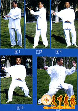 动作三:身向右转螺旋下沉,重心全部移至右腿,眼看前方,提左腿逆缠向左后斜45度铲出,重心仍偏右(图4)。