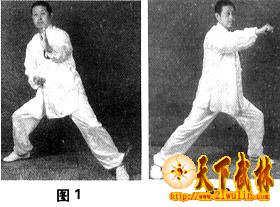 看看杂技的空中飞人表演,也会悟出爆发力的产生。杂技的空中飞人用的跷跷板就是杠杆之理。飞人静立跷跷板一端为阻力,然后两人同时跳跷板一端为动力,这样跷板立即旋转,到位又立即停止,可将阻力飞人送向空中。它也受惯性的作用,例如“掩手肱拳”。当左手立掌在胸前防护,右拳拳心朝上,放在腰间,下肢为左虚右实的右后弓步,轮轴身体应虚领顶劲,沉肩垂肘,塌腰蓄劲,尾闾中正,松胯圆裆,腰轴偏于右侧。此时,右拳为飞人阻力,左掌用力类似两人踏跷板为动力(图1)。