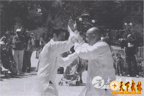 按势,意注命门,气通腰际,避其实而就其虚,避其重而就其轻。“道生一,一生二,二生三,三生万物”,双手轻松虚灵,内含干点万点,随彼变化,趁虚蹈隙,按势无穷,彼必被动矣。