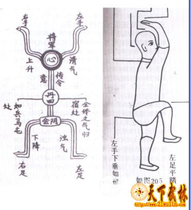 三、前后对称。 前后对称关系,主要体现以下特点。1.前去之中,必有后撑。如“搂膝拗步”左肘微扭作反背后,手束住腕向上.外方内圆.用缠丝劲,手落于后脊背上,这是后撑。左肩下沉,勿上架.顶劲以百会中气领起全身.眼看住右手中指右肩沉下。左肘撑开,外方内圆,落在胸前。中指以鼻尖相对.用缠丝劲自肩缠到手.中气行到中指头方为运足。右手在胸四五寸远.柔住劲,不可稍留硬气。这是上肢运动的要求。而下肢以腰劲向下.尻骨微泛起,小腹自然合住劲。胸腹宽宏广大.向前合往,中气贯住.上下全神,实有久用其动。到这境地,自然知其神情即至其境.亦可以意会,不可以言传也。左膝撑开.用缠丝劲白内踝外往里缠.缠到大腿根,合住劲。右膝外撑,里合缠丝劲.缠法与左腿同。双足踏实。2.退中有进.前后兼顾。如倒卷肱,从肘底看拳退行,自前向后至白鹤亮翅止.必待左脚在后方止,此是倒卷与下势分界处。右足平踏左足前掌着地,用力。退步中两手欲前先后有相合、对称之意,眼瞻 前顾后,做到撤中有守.守中有攻。3,左手往前发劲,右肘要后挣.右手往前发劲.左肘要后挣。如掩手肱拳的发劲,用缠丝劲外往里缠缠到拳,合住劲前击。左足先落地开一步,右足倒转,从后往西再开一步.不动:左足再向西开一大步,不动。左足落地,开一步;右足随身倒转,往西再一步,不移动。右足在后蹬好地.足后跟力由腿逆行而上.至脊第二十一节,再由二十一节逆行上至膀,由膀前至右拳,以助拳力。