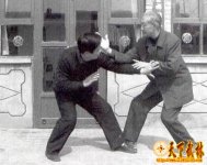 野马分鬃实战用法(口诀:野马分鬃攻腋下) 1、杨澄甫: 甲乙对立如乙右拳打来,甲速进右步,乙拳未落之时,甲右手腕抬起掤乙膀根处,往斜上方用劲,左足在后直线,左手随左腿亦可,左手 押乙右掌亦可。如甲乙对立乙起左手打来,甲亦用左脚进一步,乙手未落时即抬左手