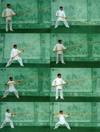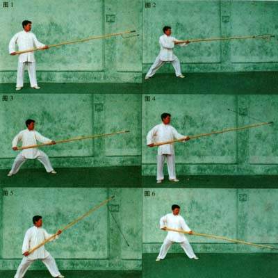 要求:两手持杆向右后划弧是蓄劲,后脚跟步是助力,进步上刺是在蓄劲基础上,发力一抖使劲达杆梢,注意要上下协调一致。