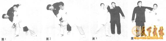 当乙方(着黑衣者,下同)上左步用右手推甲方(穿白衣者,下同)时,甲方划圆引化,双手拇指前顶按乙方手背,小指下采里勾,两劲合住(图1),前推至乙方右胯旁。