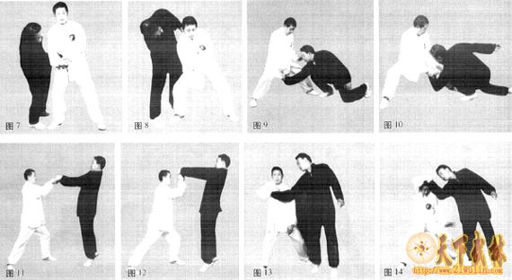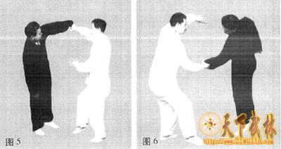 接上势,当乙方趁势转身上步用靠法解脱时,甲方应随机应变,右手立即顺缠丝划圆,走下弧采捌,并向乙方腹部前推发力,令乙方手腕疼痛,甲方左手为防护手(图四、煞腰压肘拿指腕法当乙方上右步用右手抓握住甲方右手腕时,甲方上右步管住乙方前弓之腿,同时,左手抓住乙方手腕,右手与左手配合发力。要含胸松腰,以右脚为轴,身体先左转引带,再右转发劲(图7)。